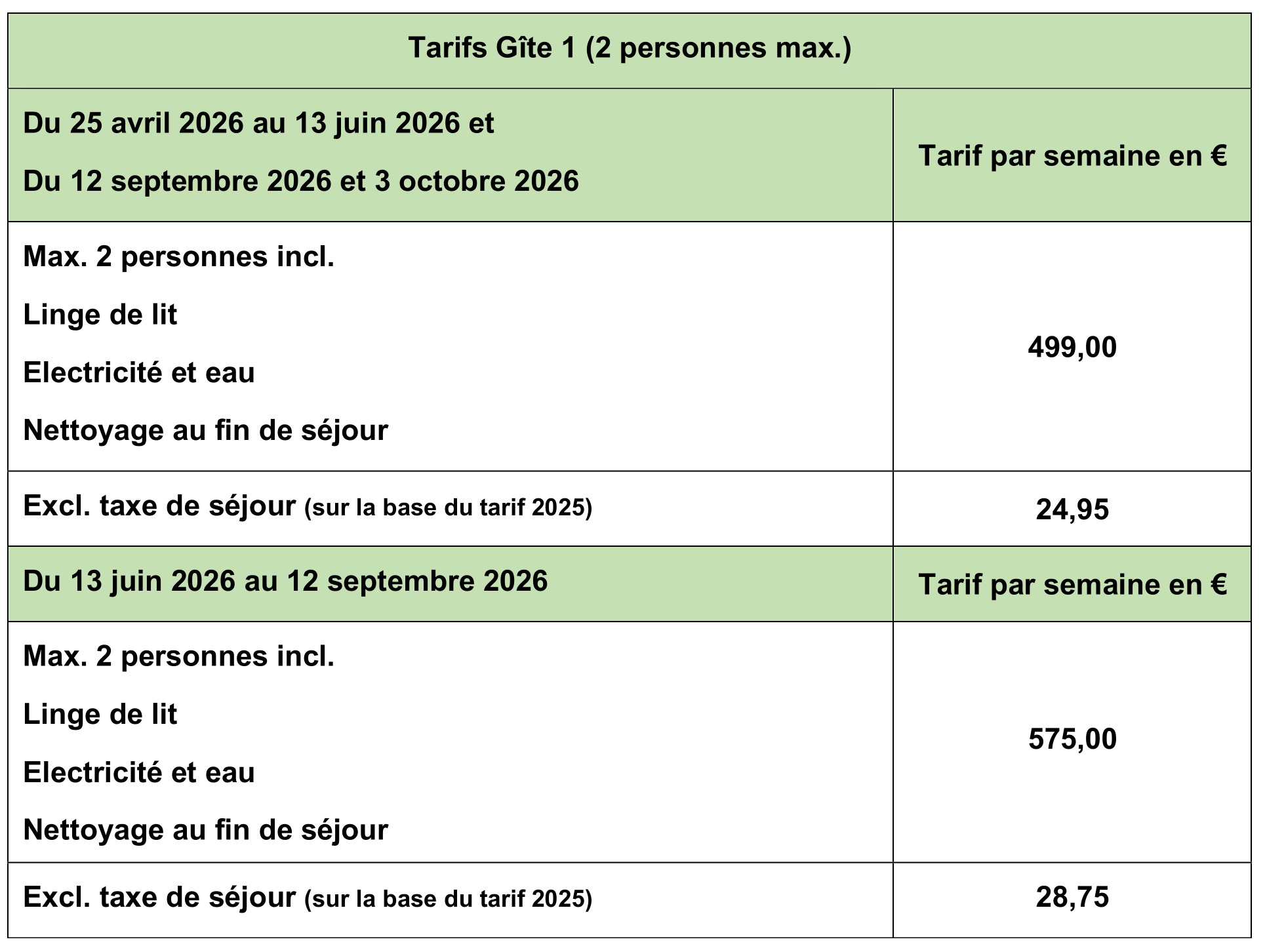 La location du gîte se fait uniquement à la semaine. Les jours d’arrivée et de départ sont le samedi. Hors saison d´autres jours d´arrivée et de départ sont possibles (sur demande). Le gîte est disponible le jour de votre arrivée à partir de 15h00. Le jour de votre départ le gîte doit être libéré à 10h00.