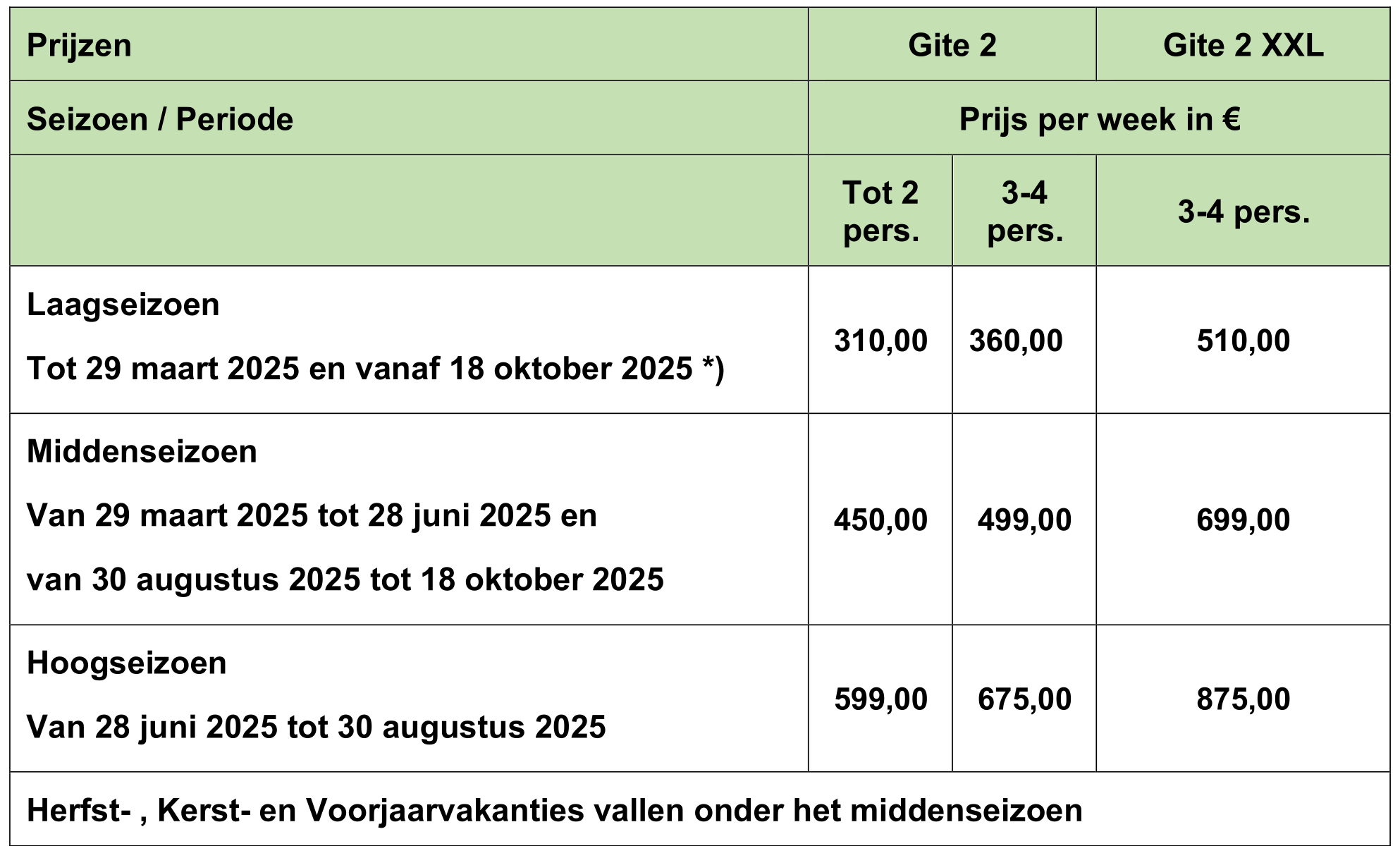 Bovengenoemde prijzen zijn inclusief beddengoed en bedlinnen, elektriciteit en eindschoonmaak, exclusief badlinnen en toeristenbelasting.